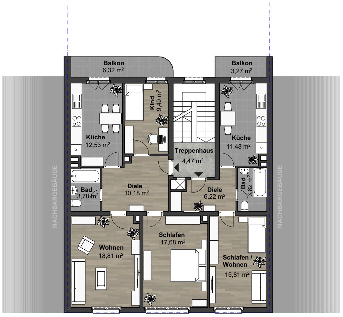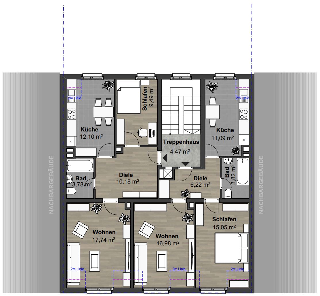 Auch das 2. Dachgeschoss des Haupthauses verfügt über weiteres Entwicklungspotenzial. Ein Ausbau zu weiterem Wohnraum mit zusätzlichen Dachaufbauten ist baulich gegebenenfalls möglich und könnte die Gesamtfläche wirtschaftlich um etwa 70—80m² erweitern. Dadurch entsteht die Chance, langfristig zusätzliche Mieterlöse zu generieren und den Gesamtwert, sowie die vermietbare Fläche des Objekts nachhaltig zu steigern.
