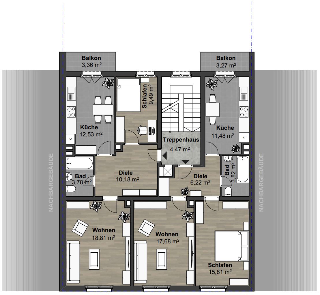 Auch das 2. Dachgeschoss des Haupthauses verfügt über weiteres Entwicklungspotenzial. Ein Ausbau zu weiterem Wohnraum mit zusätzlichen Dachaufbauten ist baulich gegebenenfalls möglich und könnte die Gesamtfläche wirtschaftlich um etwa 70—80m² erweitern. Dadurch entsteht die Chance, langfristig zusätzliche Mieterlöse zu generieren und den Gesamtwert, sowie die vermietbare Fläche des Objekts nachhaltig zu steigern.